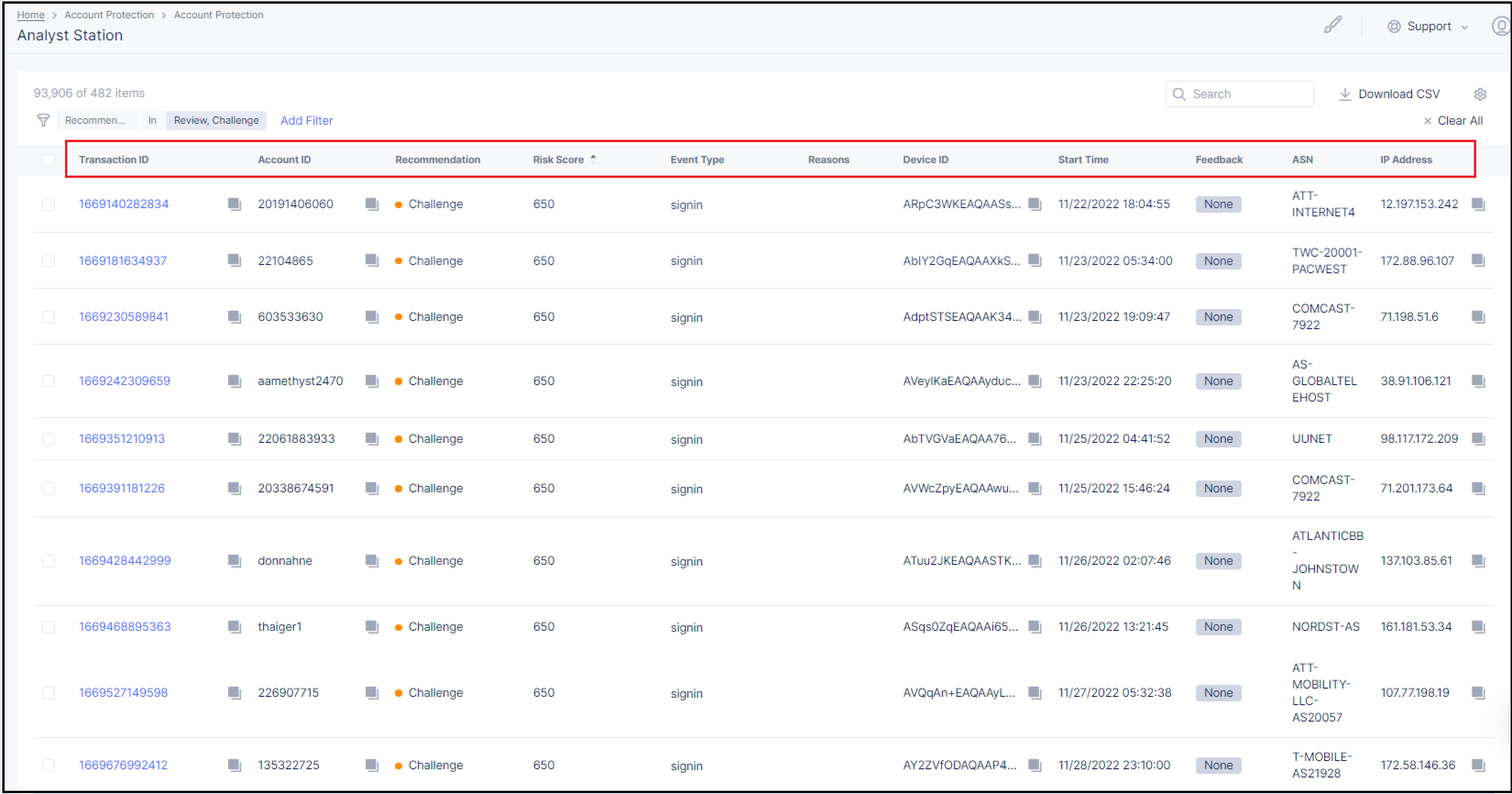 By default, the Analyst Station dashboard lists transactions that Account Protection has assigned the status of Review or Challenge. However, you can filter the display settings so that transactions with the status Block or Allow are also displayed. For instructions on how to filter the display settings, see Filtering the Transactions List.